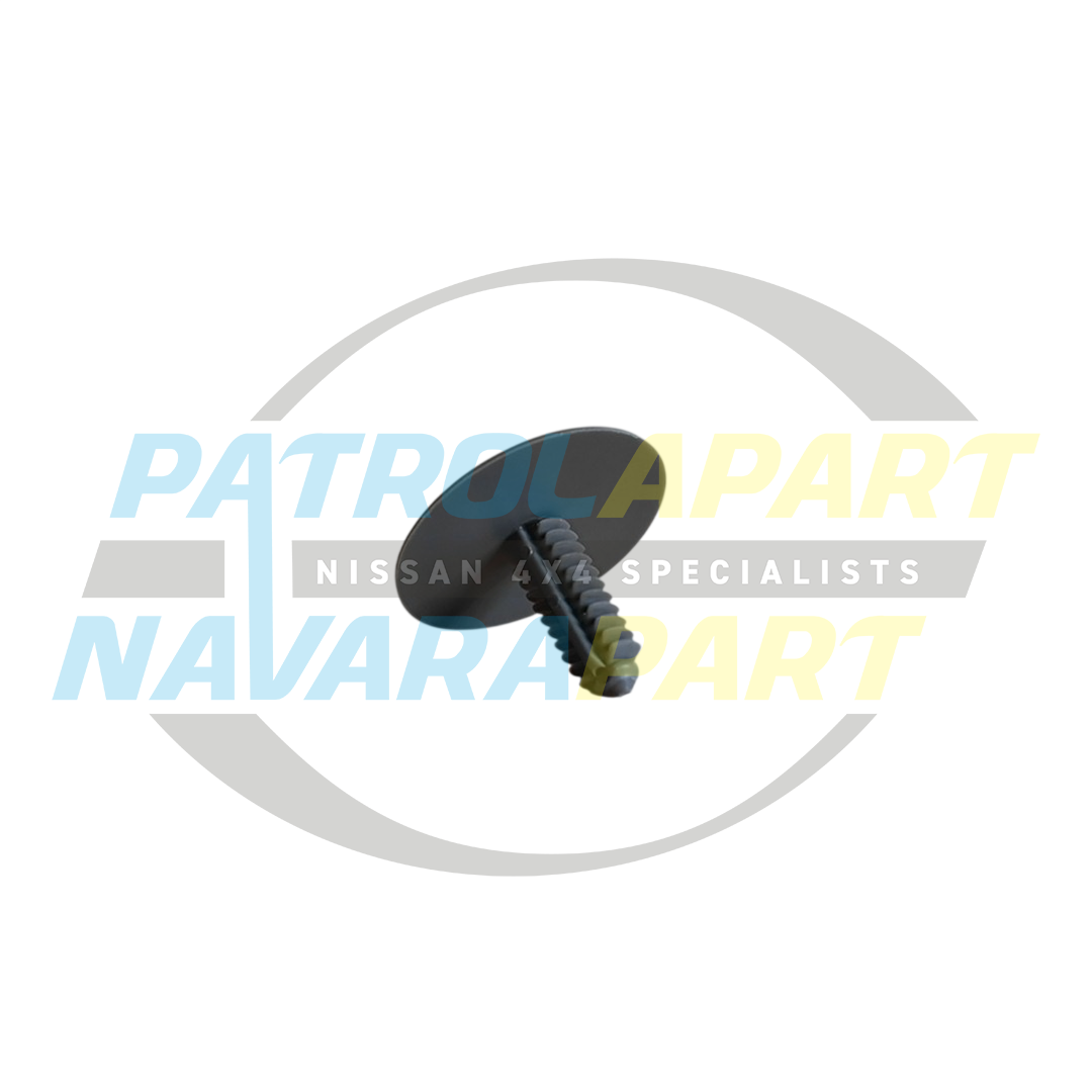 This genuine Nissan clip is used to secure the upper interior trim panel to the B-pillar of your Nissan Patrol Y61 GU Ute. The B-pillar is the vertical support frame located between the front and rear doors. These small but crucial clips are often required after becoming brittle with age and breaking during trim removal for maintenance, such as accessing the seatbelt mechanism or running wiring.